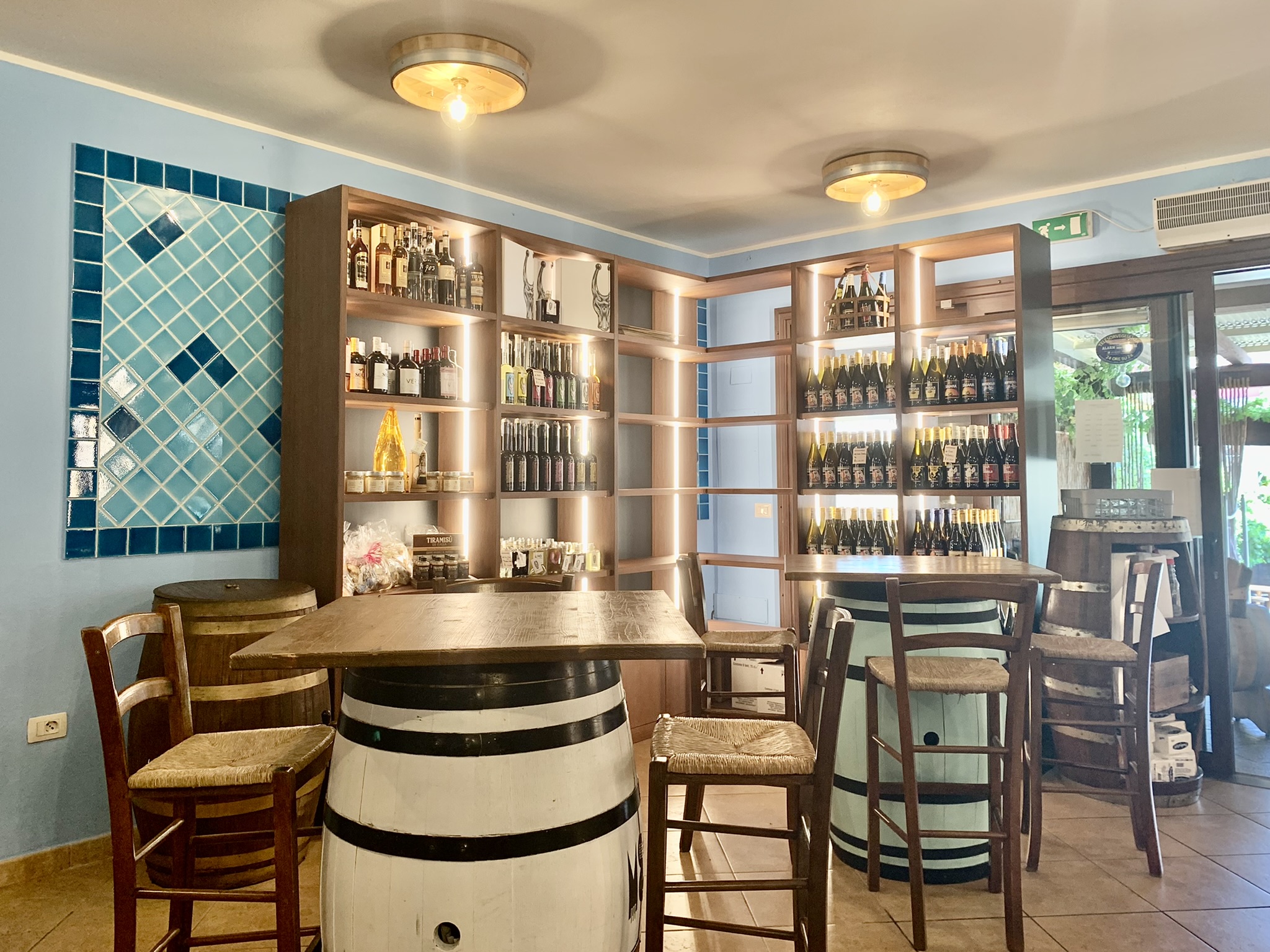 struttura banco vendita in listellare bilaminato, frontale fornito dal cliente e modificato, realizzato in tavole di rovere recuperate da vecchie botti. Piano banco in quarzo. Ante del retrobanco in listellare rivestite in acciaio, Piani in acciaio inox realizzati artigianalmente. frontale banco cocktail station in metallo naturale verniciato trasparente opaco, piani e bancalina in quarzo. Scaffali vendita realizzati in listellare di rovere con inserti e schienale in metallo naturale verniciato trasparente opaco. Strutture in metallo naturale scaldato e verniciato trasparente opaco