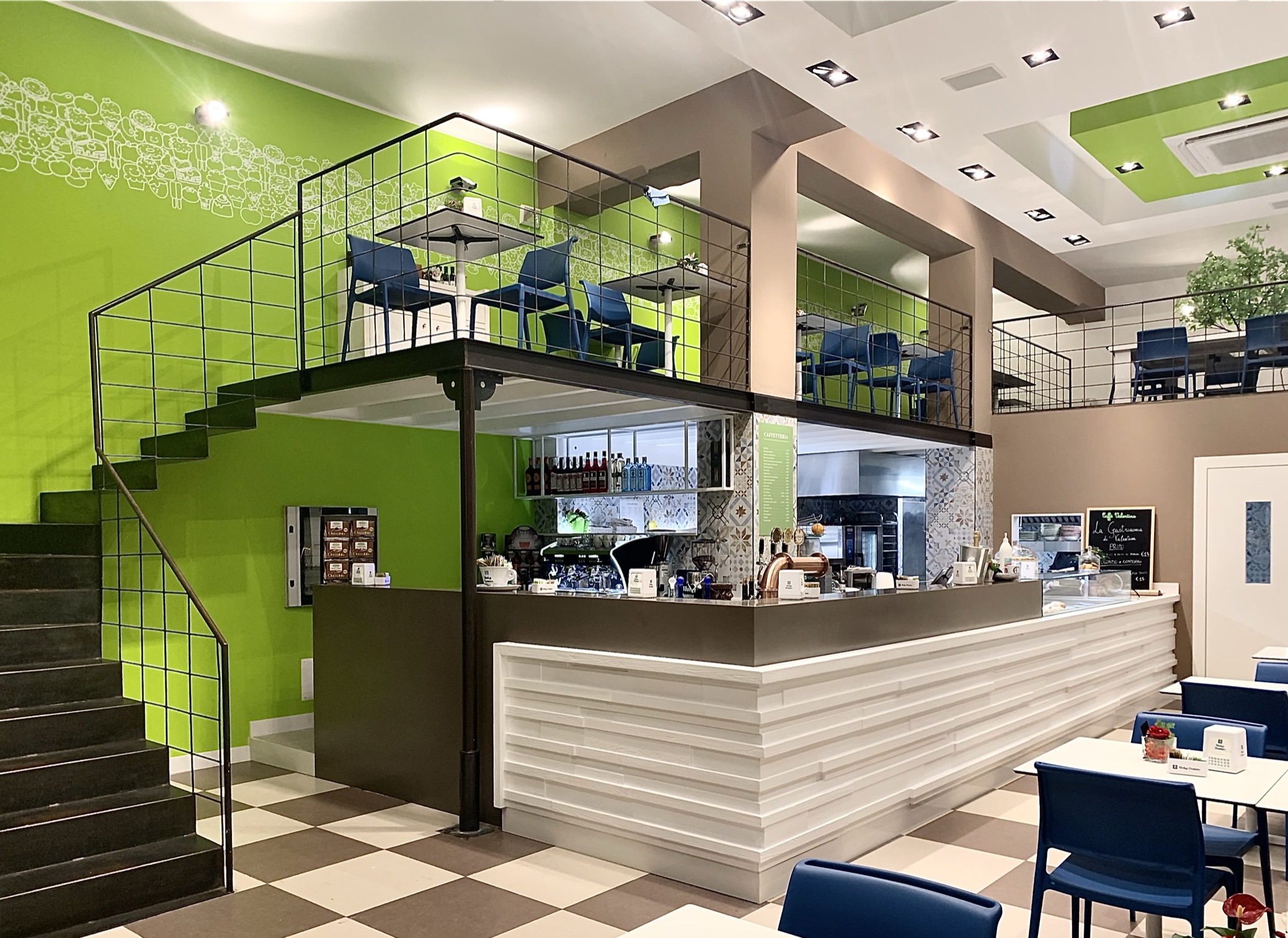 struttura in listellare bilaminato, ante del retrobanco in laminato antracite, frontale in abete spazzolato e laccato opaco. Piani in acciaio inox realizzati artigianalmente e quarzo bianco, bancalina in betacril, rivestimento parete retrobanco in riproduzione cementina in gres.