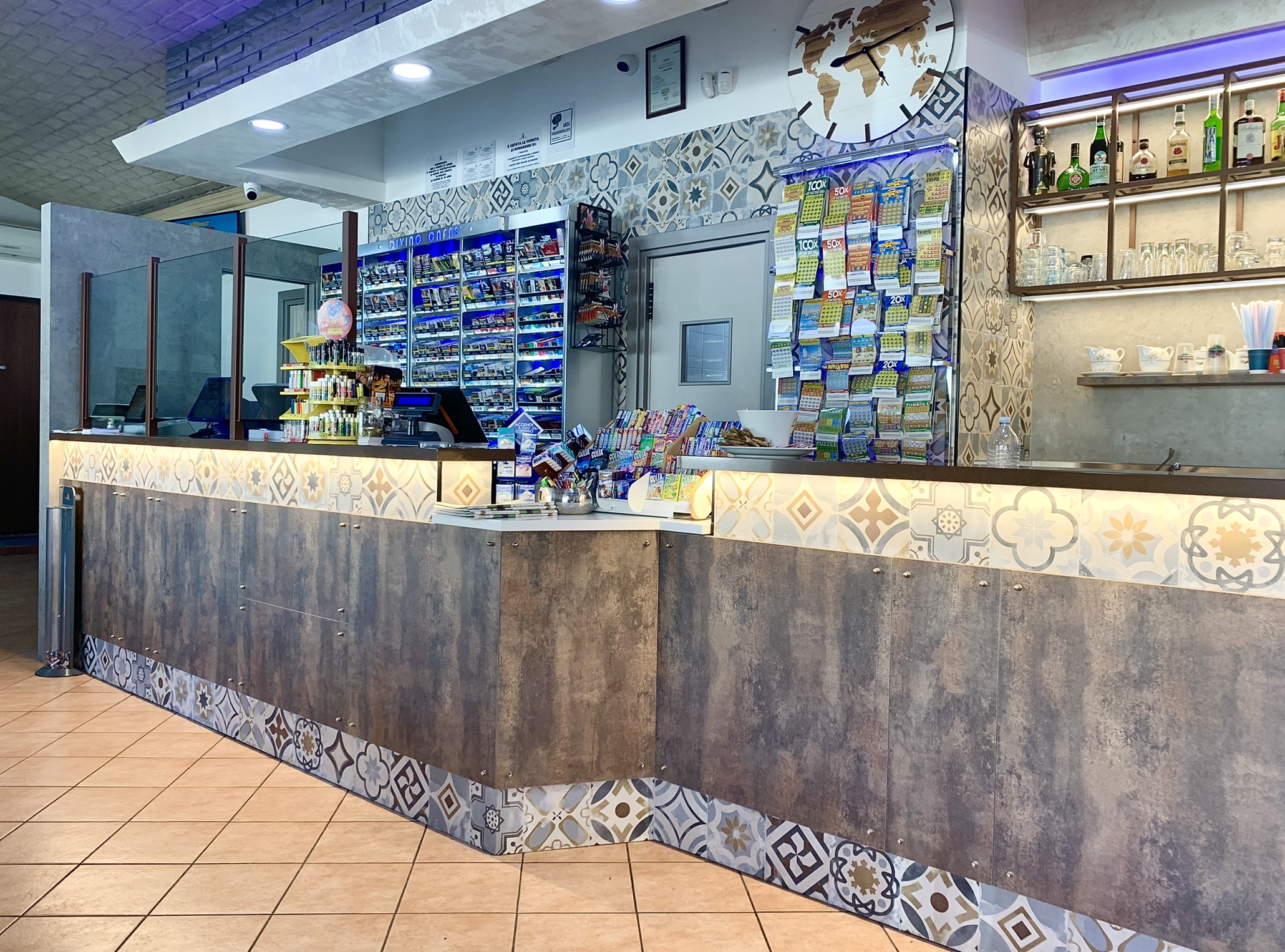 struttura in listellare bilaminato, ante del retrobanco in laminato corten, frontale in laminato antigraffio corten e inserimento di cementine in gres. Piani in acciaio inox realizzati artigianalmente e bancalina in quarzo.