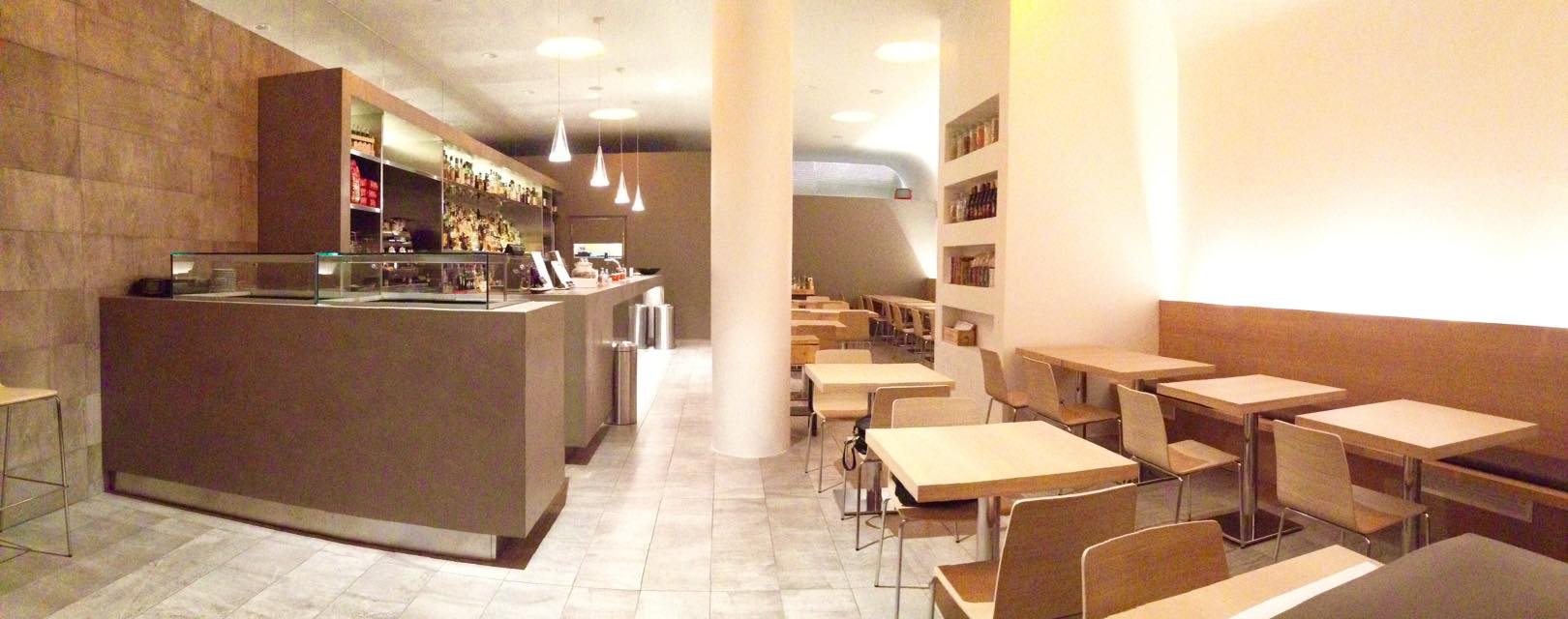 Struttura arredamento in listellare bilaminato, ante in listellare rivestito in acciaio inox, frontale banco realizzato in accicio inox e legno resinato effetto cemento, piani di lavoro in acciaio inox, piani tavoli e panche realizzati in rovere naturale.