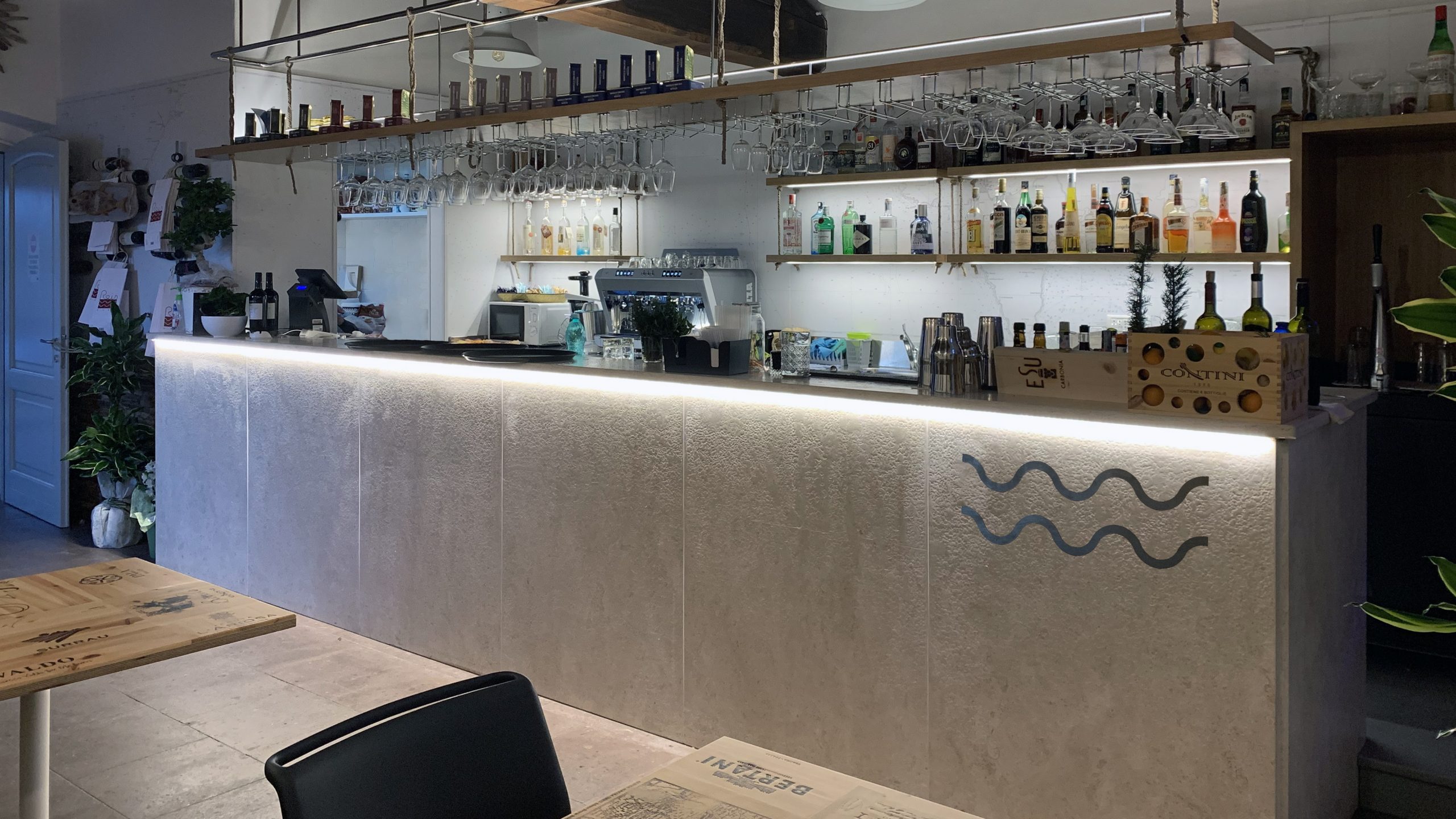 Struttura arredamento in listellare bilaminato, ante del retrobanco in rovere naturale con estetica a doghe, frontale banco realizzato in marmo di Orosei acidaro, alzata retrobanco rivestita con vinilico a stampa carta nautica, piani di lavoro in acciaio inox realizzati artigianalmente, piani tavoli realizzati in falegnameria sfruttando vecchie cassette di vino, boiserie realizzata con vecchi legni di recupero invecchiati dalle intemperie.